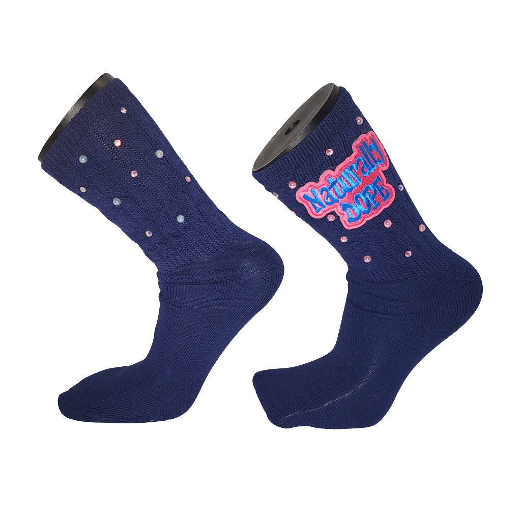 Upgrade your sock game with our Naturally Dope Navy Blue Junkie socks. These stylish socks feature a cute pink design and diamond bling, making them a must-have for any fashion-forward individual. Made for adults in sizes 6-8. These socks are both comfortable and fashionable, making them the perfect addition to any outfit. Elevate your style with our Naturally Dope socks today. Design may vary.